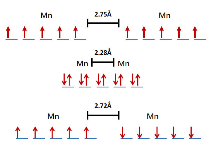 分子軌域形成時的一種特殊狀況:Broken symmetry,指的是形成分子軌域的兩個原子軌域一個都為Alpha spin另一個全為Beta spin的狀況,這種狀況讓分子能量最低、最穩定,常發生在過度金屬上,這邊以上述例子中的兩個錳金屬為例,最上面的狀態為電子都沒有成對,而且都是Alph a spin 的狀態。中間則為成對的狀況,而最下面的例子便是Broken symmetry的情形。隨著電子Alpha spin及Beta spin的不同,兩個錳 金屬間的距離也不相同。若電子全為Alpha spin,兩金屬間的排斥力相對較大,造成兩金屬的距離較遠。相反的,若Alpha 與Beta spin 成對於兩金屬之間,則造成兩金屬的距離較近。