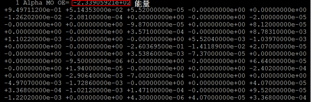 ORCA Output檔中將屬於各個能量的所有MO係數表現在同一個直欄上,並且每次只有五個欄位(五個能量),當係數結束後,同一個直攔便會有下個能量及其所屬係數,所以第一個能量及第六個能量與係數為同一直欄,第二與第七的能量與係數在同一直欄,以次類推。