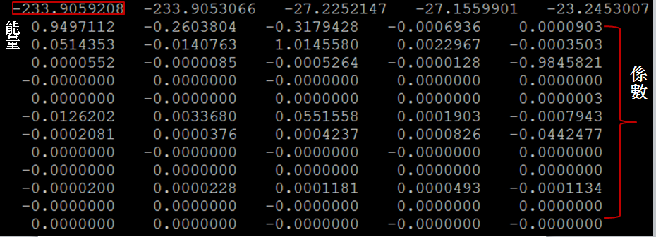 Gaussain Input檔的格式則將屬於各個能量的所有係數,以橫行表示,並且每五個係數變換行。
